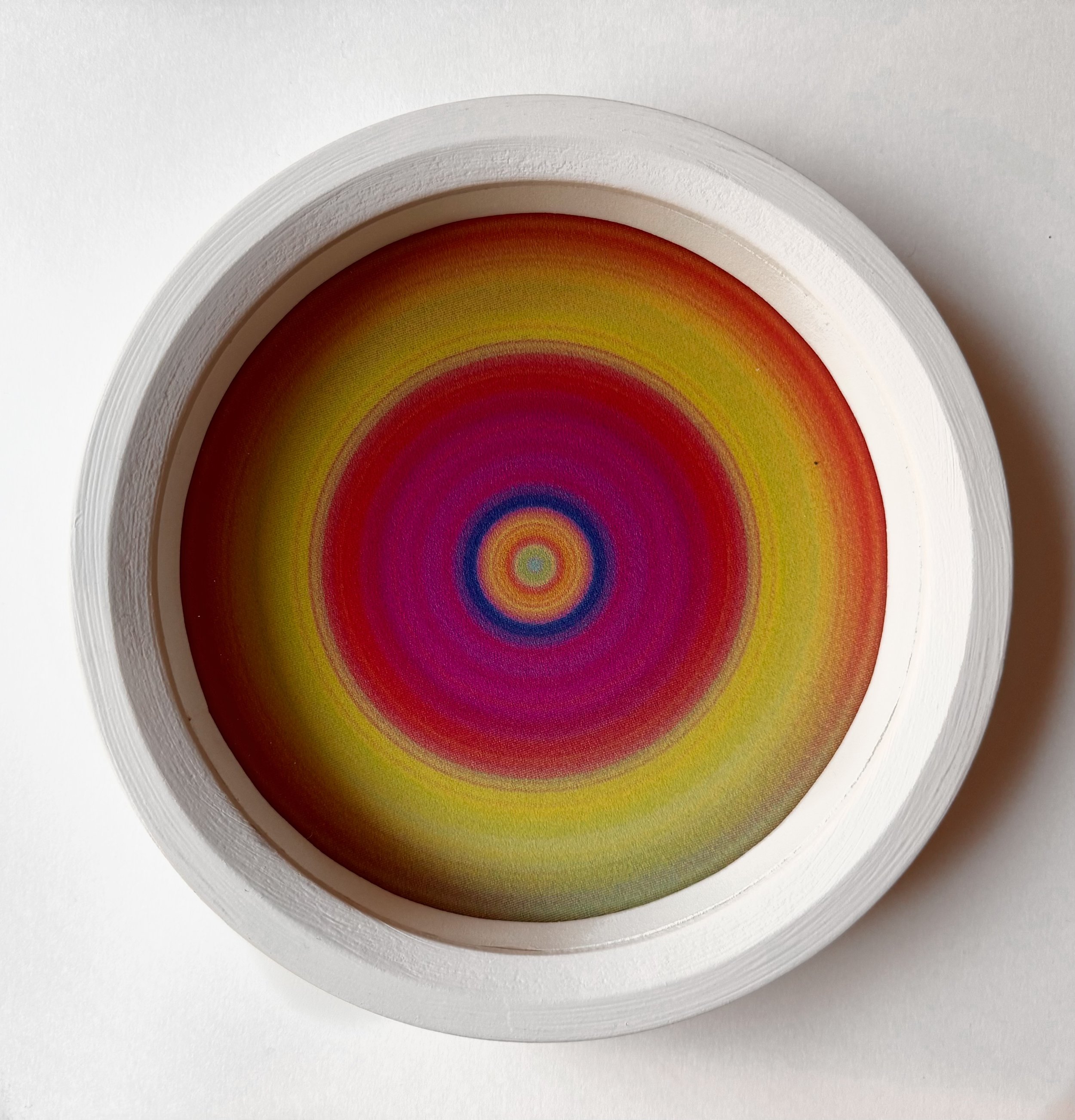After years of sculpting hand-built and wheel-thrown ceramic forms, Hutcheon has shifted to two-dimensional work, embracing a vivid colour palette in place of the muted tones of stoneware glazes. Elements of his earlier asymmetric ceramics still influence his paintings and occasionally inspire the design of his custom polygonal frames.